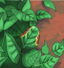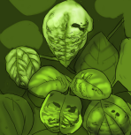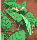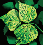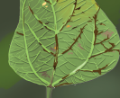 • Fèy yo gen yon pakèt pwen ki sanble bagay dlo kòmanse pouri (imaj 1). Plis tan ap pase, yap vin pi  laj epi pi fonse. Lè yo kontre, fèy la vin tankou yon bagay ki boule, men sou kote yo gen koulè jòn pal  (imaj 2).