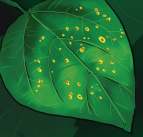 Fèy yo se pati nan plant la ki pi atake. Yo gen yon pakèt ti pwen nwa oubyen mawon ki antoure ak koulè jòn. Apre 4  jou, ti pwen sa yo bay yon poud ki gen koulè wouy (imaj 10  ak 11).